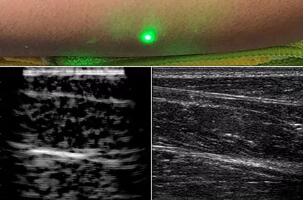 研究人員用一種激光裝置測試了這個想法,該裝置使用一個波長為1,550納米的脈沖激光來產(chǎn)生聲波,并使用第二個連續(xù)激光,調(diào)諧到相同的波長以遠程檢測反射的聲波。第二個激光器是靈敏的運動檢測器,可測量聲波從肌肉,脂肪和其他組織反射回來而引起的皮膚表面振動。反射的聲波產(chǎn)生的皮膚表面運動會導(dǎo)致激光頻率發(fā)生變化,這種變化可以測量。通過機械掃描人體上的激光,科學(xué)家可以獲取不同位置的數(shù)據(jù)并生成該區(qū)域的圖像。