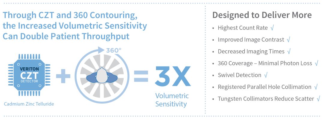 VERITON ?獨有的360°設計產(chǎn)生3倍的體積靈敏度,為PET提供了真正的分子成像替代品。使用更具成本效益的示蹤劑結合新的更高分辨率SPECT圖像細節(jié)來擴展您的核診斷服務。