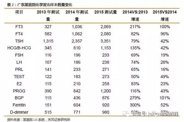 廣東省某基層醫(yī)院,一級(jí)甲等,2014年檢驗(yàn)科收入約為1000萬。2013年開始使用國(guó)產(chǎn)全自動(dòng)發(fā)光儀,開展項(xiàng)目主要為甲功、激素兩個(gè)套餐。2015-2013年樣本增量變化如下。