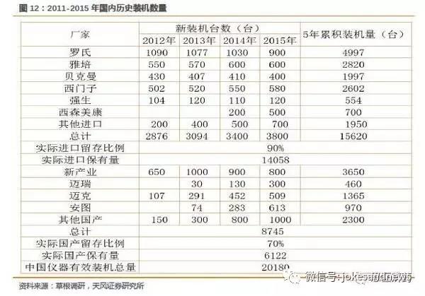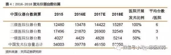 根據(jù)以上邏輯,我們大致可以測(cè)算目前的存量市場(chǎng),發(fā)光還未完全滿足終端需求,2015年儀器保有量來看,只滿足了60%的需求。而未來需求端的增長(zhǎng)依然保持極高的增速,除了進(jìn)口企業(yè),少量國(guó)產(chǎn)優(yōu)秀品牌可以分享藍(lán)海市場(chǎng),儀器裝機(jī)依然有很大的空間待開發(fā)。