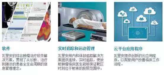 瓦里安提供的服務(wù)主要是其為放療系統(tǒng)開發(fā)的一系列輔助手段,包括綜合腫瘤治療軟件、放療實(shí)時追蹤和運(yùn)動管理系統(tǒng)以及云平臺應(yīng)用。