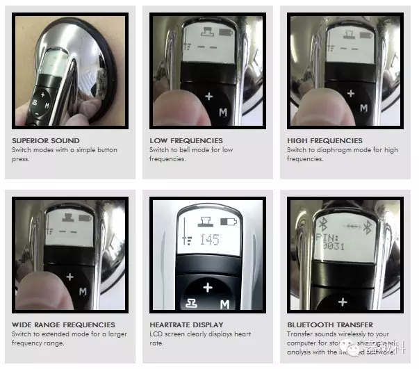 2009年,電子聽(tīng)診器的發(fā)展達(dá)到了新的巔峰,Littmann®3200型電子聽(tīng)診器(上圖)出現(xiàn)在世人面前。這是首個(gè)運(yùn)用藍(lán)牙技術(shù)的電子聽(tīng)診器,它能夠?qū)⑿呐K、肺部和其他身體器官的信號(hào)無(wú)線傳送到醫(yī)師使用的電腦,并通過(guò)Cardioscan軟件實(shí)時(shí)地將聲音曲線顯示在電腦屏幕上,更準(zhǔn)確地揭示患者心臟可能存在的異?,F(xiàn)象。隨后,軟件會(huì)對(duì)聲波曲線進(jìn)行分析,并將代表有害雜音的異常部分的細(xì)節(jié)突出顯示出來(lái)。醫(yī)師能夠?qū)⒒胤潘俣冉档鸵话雭?lái)更仔細(xì)地分析問(wèn)題,還能將文件保存到患者的檢查結(jié)果中,并通過(guò)電子郵件和Scope to Scope遠(yuǎn)程聽(tīng)診軟件,將其發(fā)送給心臟病專家來(lái)確認(rèn)診斷結(jié)果。這套系統(tǒng)不僅能夠準(zhǔn)確捕捉到危險(xiǎn)的雜音,還能減少更為昂貴心電圖檢查費(fèi)用和不必要的心臟病專家的診療工作。從此傳統(tǒng)的電子聽(tīng)診器變成了先進(jìn)的醫(yī)療工具,取代了醫(yī)師對(duì)心臟雜音的猜測(cè),提高了診斷能力。隨后3M公司推出了一系列改良產(chǎn)品......目前這方面3M公司的最新產(chǎn)品是Littmann4100系列(下圖)