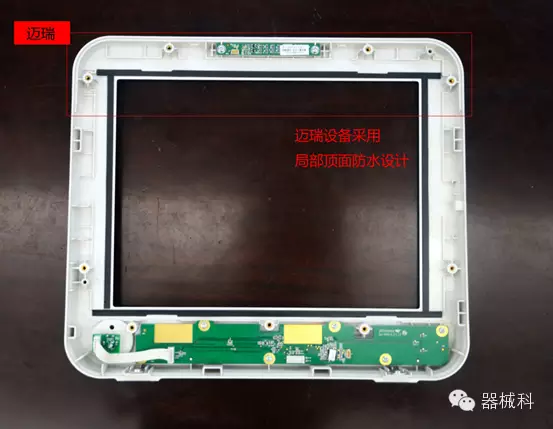 防水是所有電子類產(chǎn)品的一個重要功能。如果防水功能設計不好,儀器很容易受潮,從而引起使用不便,嚴重的將會報廢。科曼前后殼之間采用硅膠密封線整圈的防水設計,做工更麻煩,耗材多,但更安全;邁瑞前后殼之間采用硅膠密封線頂部的局部防水設計,省時省料,但存在安全隱患。