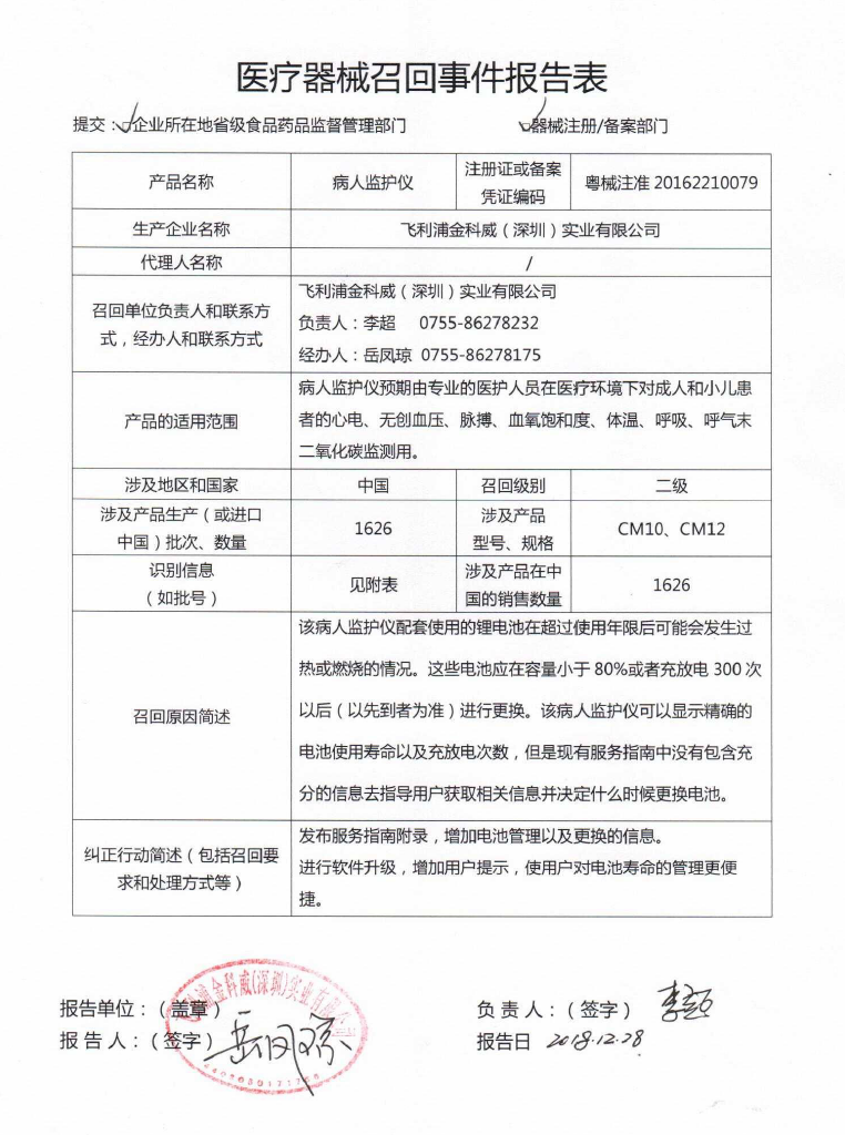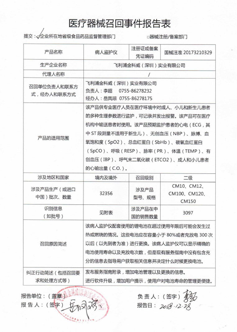 2018年,飛利浦也曾發(fā)布了多起對病人監(jiān)護儀的召回,其中一份召回報告也是二級召回,涉及到2672臺監(jiān)護儀,同樣是通過監(jiān)控內(nèi)部產(chǎn)品投訴發(fā)現(xiàn),存在鋰離子電池超過預期使用壽命后發(fā)熱或燃燒風險。