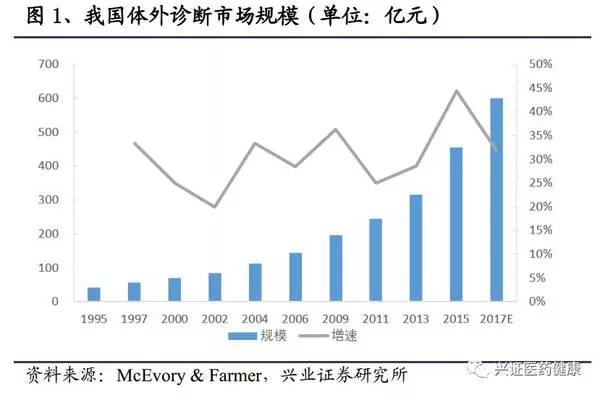 我國體外診斷行業(yè)相較于歐美市場,起步較晚,但發(fā)展快速,2015年,我國IVD市場規(guī)模達450億,預計2017年市場容量有望擴增至600億。