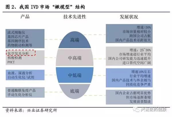 產(chǎn)品結構上,我國體外診斷行業(yè)總體呈現(xiàn)“橄欖型”結構:低端市場是前期廣泛使用的檢驗技術,發(fā)展空間小,增速緩慢,正在進行方法學上的更新和迭代;中端市場由于近幾年國產(chǎn)研發(fā)能力迅速提升,渠道優(yōu)勢明顯,國內(nèi)產(chǎn)品正在處在高速發(fā)展階段;高端市場由于技術壁壘高,國內(nèi)外差異大,主要為國外產(chǎn)品,國內(nèi)產(chǎn)品目前在研發(fā)潛伏期,未來將迎來增長。