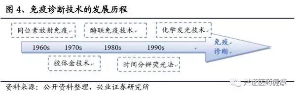 免疫診斷的發(fā)展需要依靠免疫學技術的不斷革新,免疫診斷的變革依次經(jīng)歷了放射免疫檢驗(RIA)、膠體金快速檢驗、酶聯(lián)免疫檢驗(ELISA)、時間分辨熒光免疫(TRFIA)的迭代,最終迎來了化學發(fā)光免疫檢驗(CLIA)的時代。