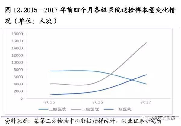 分級診療是近些年國內(nèi)醫(yī)療界的重要課題,2015年國務院發(fā)表指導意見,以提高基層醫(yī)療服務能力為重點,以常見病、多發(fā)病、慢性病分級診療為突破口,完善分級診療制度。在2017年兩會再次重申,在2017年底前要完成85%的覆蓋率。將來,明確診斷將作為基層醫(yī)院承擔的重要任務,而今基層醫(yī)院缺乏專業(yè)檢驗人員和檢驗設備的現(xiàn)狀,將使得近幾年基層檢驗需求呈井噴式爆發(fā)。