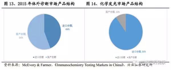在我國體外診斷市場規(guī)模中,進口廠家占據(jù)一半以上的市場份額,國內(nèi)產(chǎn)品呈追趕勢頭。在生化檢驗領域,國內(nèi)廠家基本實現(xiàn)進口替代;而免疫、分子等技術壁壘較高的領域,國內(nèi)廠家前幾年剛剛起步,發(fā)展迅猛。化學發(fā)光行業(yè)是免疫診斷中技術最先進的部分,目前國內(nèi)市場仍被羅氏、雅培、貝克曼、西門子四巨頭霸占,高端市場尤甚。2011年新產(chǎn)業(yè)推出第一臺全自動化學發(fā)光儀,國產(chǎn)發(fā)光公司加入市場競爭,目前國產(chǎn)約占10%市場份額,進口替代空間巨大。