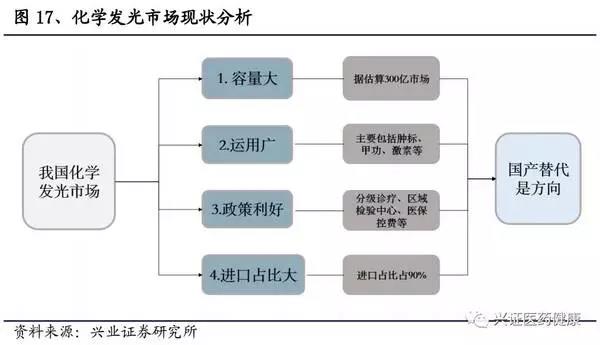 目前,化學發(fā)光行業(yè)以25%-30%的增速增長,現(xiàn)國內(nèi)企業(yè)已突破技術壁壘,進入銷售放量階段,參考生化替代的節(jié)奏,5年內(nèi)可占有近一半的市場份額。預計在2021年,國內(nèi)廠家可總共占有百億以上的市場份額。
