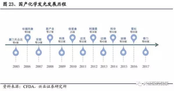我國化學發(fā)光市場被進口企業(yè)壟斷已久,長期以來內(nèi)資企業(yè)以代理國外產(chǎn)品獲得收益。在代理的過程中,內(nèi)資企業(yè)慢慢積攢經(jīng)驗,逐步開始自主研發(fā)的道路。經(jīng)歷10多年的發(fā)展,現(xiàn)獲得發(fā)光批文的廠家有數(shù)十家,新產(chǎn)業(yè)于2010年推出第一臺全自動化學發(fā)光分析儀,國產(chǎn)機器正式進入化學發(fā)光領域,2017年普門電化學發(fā)光儀剛剛獲批,預期未來會大有作為。近幾年,技術壁壘被逐步突破,國產(chǎn)化學發(fā)光進入鋪開放量期。