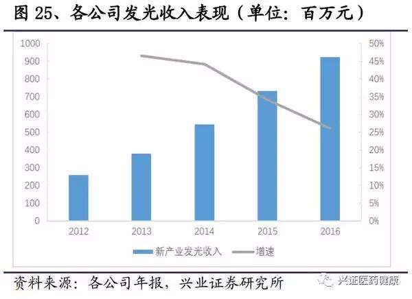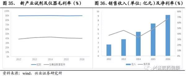 新產(chǎn)業(yè)2016年總收入9.23億元,絕大部分為發(fā)光產(chǎn)品,2012-2016年,新產(chǎn)業(yè)收入復合增速保持在37%左右。其中試劑增速較高,保持在35%以上,隨著儀器投放的增加,試劑的增速將會上升。由于近幾年空白市場將逐漸被消化,儀器的增速將呈現(xiàn)下降的態(tài)勢。