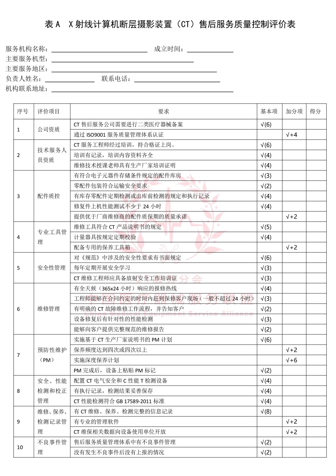 醫(yī)療器械售后服務(wù)質(zhì)量管理是醫(yī)療器械使用質(zhì)量管理的重要一環(huán),為加強(qiáng)e中國醫(yī)療器械服務(wù)聯(lián)盟會(huì)員企業(yè)X射線計(jì)算機(jī)斷層攝影裝置(CT)售后服務(wù)質(zhì)量管理,貫徹執(zhí)行《醫(yī)療器械監(jiān)督管理條例》、《醫(yī)療器械使用質(zhì)量監(jiān)督管理辦法》等規(guī)定、標(biāo)準(zhǔn)和規(guī)范,進(jìn)一步提升和統(tǒng)一獨(dú)立服務(wù)提供商的售后服務(wù)水平、保證設(shè)備使用質(zhì)量和安全,提高客戶服務(wù)滿意度,制定本規(guī)范,作為指導(dǎo)聯(lián)盟會(huì)員企業(yè)在X射線計(jì)算機(jī)斷層攝影裝置售后服務(wù)質(zhì)量管理和控制工作的評(píng)價(jià)標(biāo)準(zhǔn)。